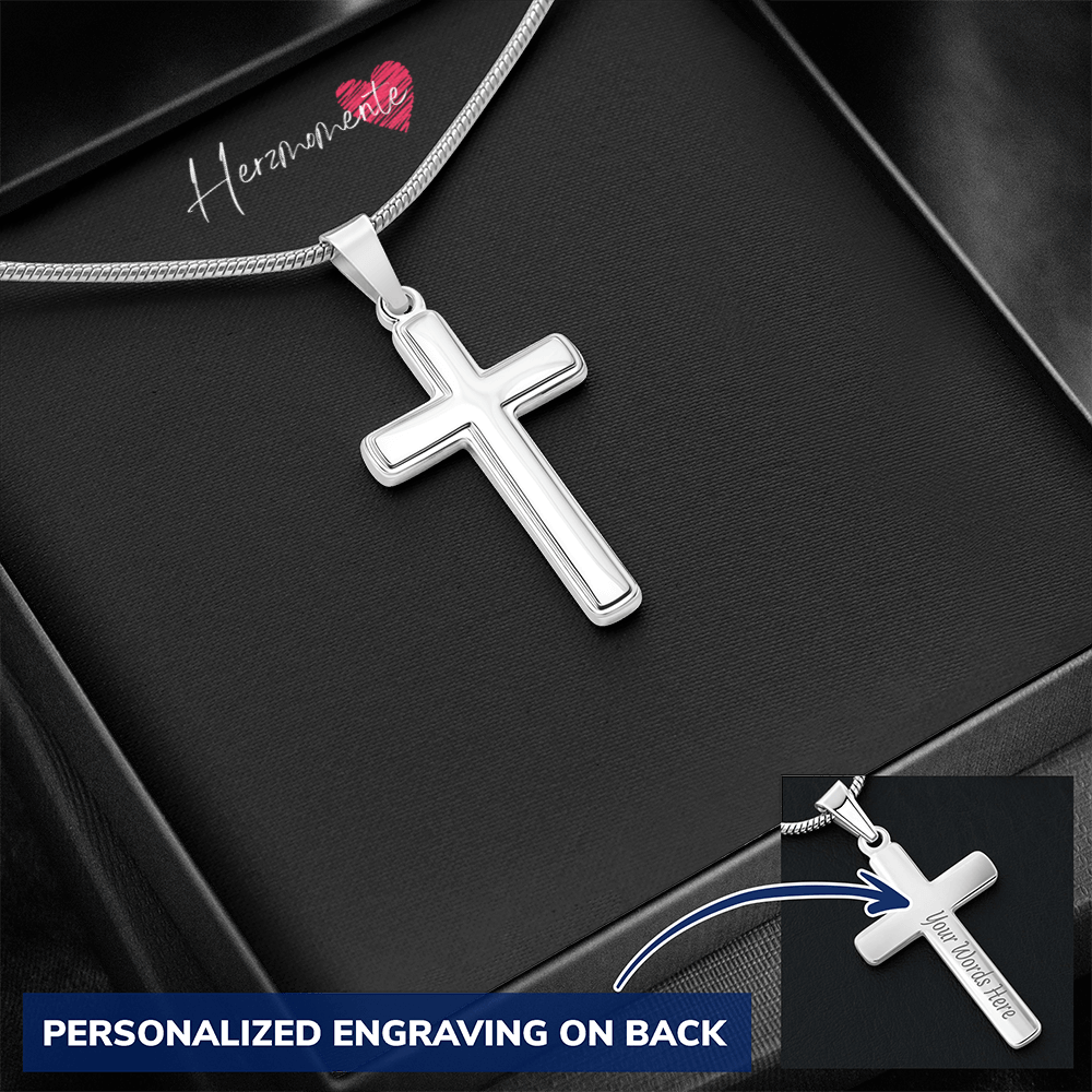 Personalisieren Sie eine Nachricht auf der Rückseite des Kreuz-Anhängers mit bis zu 20 Zeichen. Beinhaltet eine verstellbare kubanische Kettengliedkette (18" - 22").